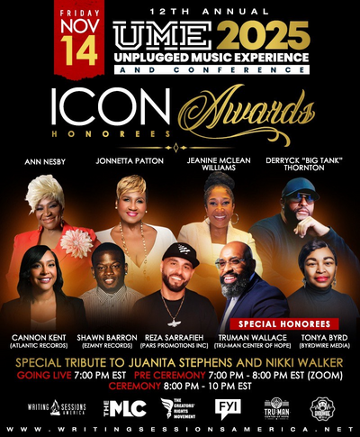 The 12th Annual Unplugged Music Experience (UME) 2025 Virtual Conference, taking place November 13–16, 2025, under the theme “Era of the Indi-Preneur.” This event is specially designed for business-minded singers, songwriters, and producers thriving as music entrepreneurs. Our premier event, the ICON AWARDS, honors some of today’s top executives and creatives in the music business and will take place on Friday, November 14, 2025, at 8 p.m. EST.